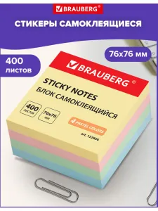 Бумага / стикеры / блок для заметок самоклеящиеся, Brauberg, Пастельный, 76х76 мм, 400 листов, 4 цвета